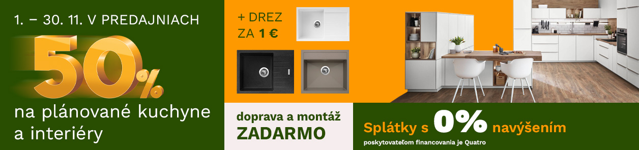 Ste pripravení na zmenu? Práve teraz je ten správny čas! Máme pre vás jedinečnú akciu, vďaka ktorej môžete získať plánovanú kuchyňu alebo interiér so zľavou 50 %. Teraz navyše s dopravou a montážou úplne zadarmo. A pretože vieme, že nová kuchyňa sa bez neho nezaobíde, pridáme vám k nej drez len za 1 €.